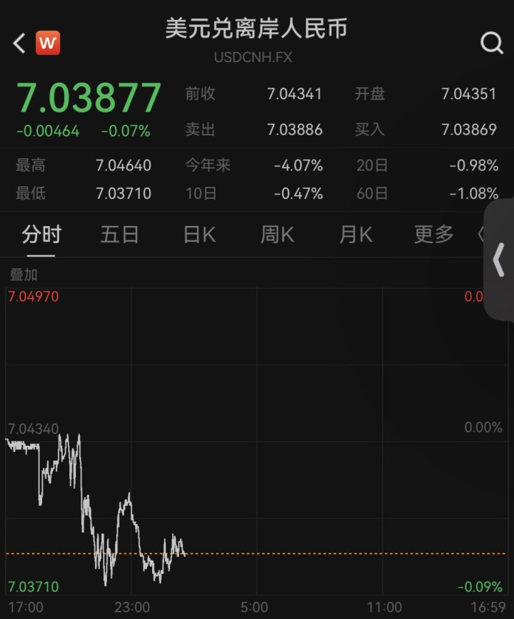在岸市场上,人民币对美元即期汇率盘中最高升至7.0417,创下2024年10月以来新高。